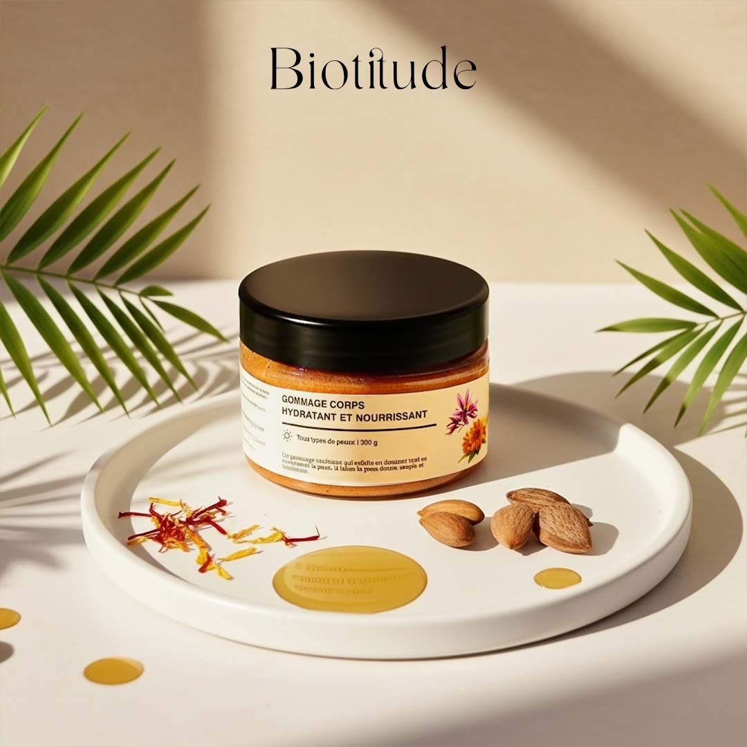 Découvrez notre gommage corps unique, conçu pour exfolier, nourrir et révéler un éclat naturel.